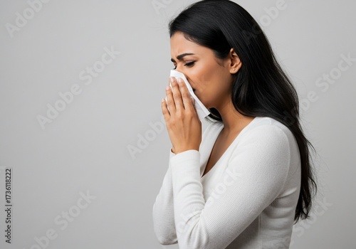 woman, sick, flu, cold, tissue, health, unwell, disease, disease, allergy, sneezing, virus, infection, germ, hygiene, health care, medicals, studio shot, portrait, young, female, brunette, miserable, sleepy, discomfort, pain, suffering, respiratory, problem, symptom, contagious, sanitary, cleaning, cleanliness, personal hygiene, sanitation