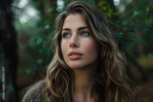 Young woman with long brown hair, blue eyes. In a dark dense forest.