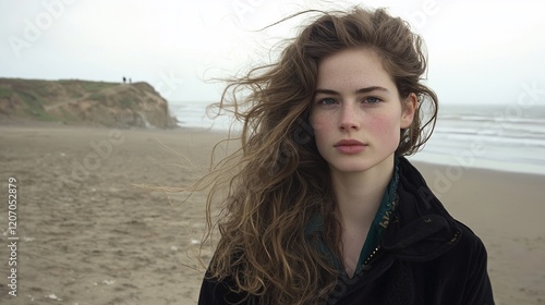 woman, girl, beach, ocean, hair, wind, sea, sand, coast, portrait, young, beautiful, model, face, eye, brown, blond, wave, nature, outdoors, landscape, casual attire, fashion, pretty, attractive, calm, pensive, serious, alone, day, sky, summer, travel, holiday, freedom, happy, healthy, lifestyle, romantic, view, horizon, cliff, person, female, adult, expression, pose, style