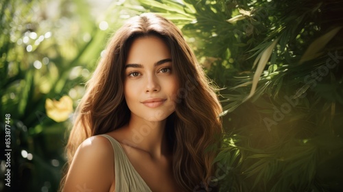 Young woman with long, wavy hair and natural makeup standing in a lush, sunlit garden. She wears a light green dress, exuding calmness and grace