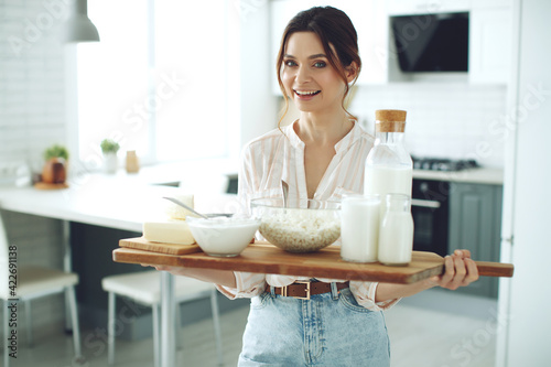 woman, milk, health, food, happy, dairy, people, organic, person, home, kitchen, calcium, refrigerator, stomach, glasses, good, healthy, away, look, hand, nubes, vitamin, diet, nourishment, open, female, eat, adult, middle, offering, beauty, lifestyle, meal, part, young, shape, tract, berry, white, breakfast, cooking, constructed, background, concept, fruit, granola, her, fresh