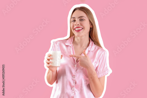 milk, pink, woman, young, adult, background, beautiful, beverage, bottle, breakfast, calcium, casein, caucasian, colours, dairy, delicious, diet, drink, drinking, female, fresh, girl, happy, healthy, lactose, morning, natural, nourishment, organic, pajama, pasteurized, people, person, portrait, product, protein, tasty, vitamin