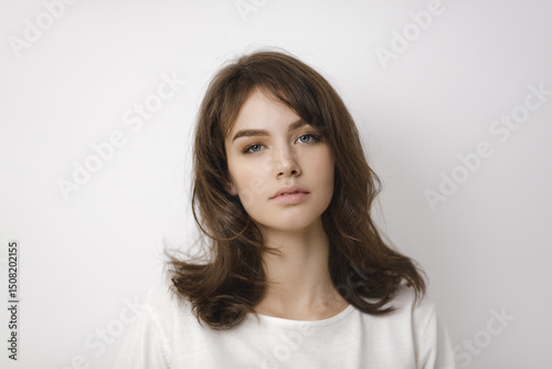 woman, natural beauty, caucasian, young adult, brunette, wavy hair, portrait, casual attire, white top, stylish, minimalism, photogenic, confident, modern, attractive, fresh, chic, simplicity, trendy, feminine, youthful, elegance, glamour, relaxed, model, charming, skin, poised, editorial, fashionable, effortless, high-quality, stunning, natural light, facial features, promotional, calm