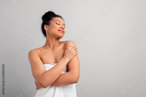 morning, comfort, female, woman, young, girl, beauty, salon, natural, cosmetology, spa, skin, body, care, bodycare, skincare, style, model, beautiful, sensual, sexy, feminine, gentle, black, hair, african, american, multinational, procedure, grey, white, background, routine, pampering, cleansing, nourishing, wellness, confidence, serenity, sophistication, towel, washing, bathe, hydratation, fresh, silky, bathroom, cream, lotion, gel