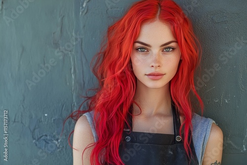 Young woman with orange hair and freckles, working in a rustic caf setting during daylight hours