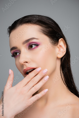 young woman with pink eye shadows and bare shoulders touching lips isolated on grey