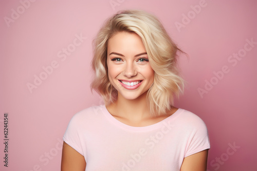 woman, beauty, hair, person, face, smile, people, fashion, model, smiling, 1, pink, studio, blond, blond, dress, happiness, lady, cute, looking, joy, expression, generative, ai, glamour, casual attire, elegance, eye, red, teeth, closeup, look, skin, care, make-up, coiffure, make-up, sensuality, long