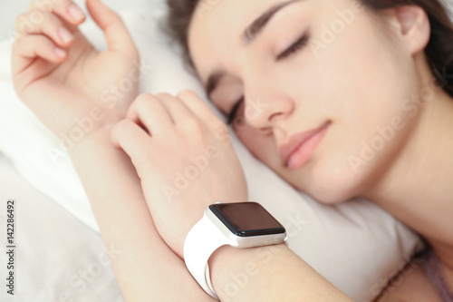 Young woman with sleep tracker resting in bed at home