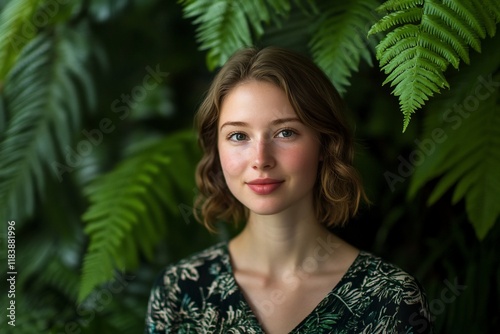 Young woman with wavy brown hair, wearing a floral dress, smiles gently against a backdrop of lush green ferns.