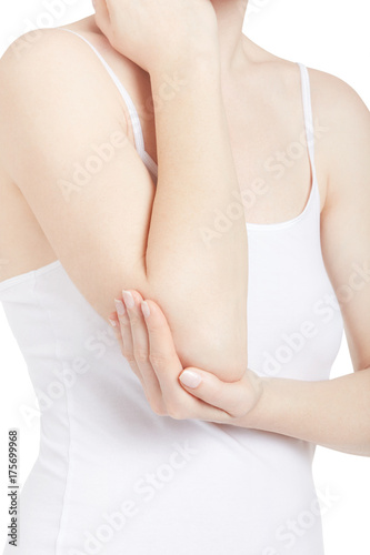 pain, elbow, woman, young, arm, caucasian, isolated, white background, adult, hand, shirt, human, injury, medicine, physical, joint, painful, clipping path, body, arthritis, white, health, health care, medicals, anatomy, disease, inflammation, tendon, rheumatism, pressure, holding, person, bruised, acute