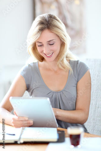 woman, girl, technology, electronic, touchpad, touch screen, pad, pda, sitting, caucasian, 25, websurfing, wireless, android, cyberspace, screen, job, work, working, business, relaxed, smiling, happy, joyful, cheerful, blond, agenda