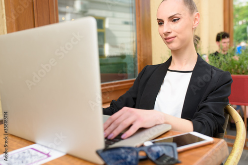 Young woman working on her laptop typing rext
