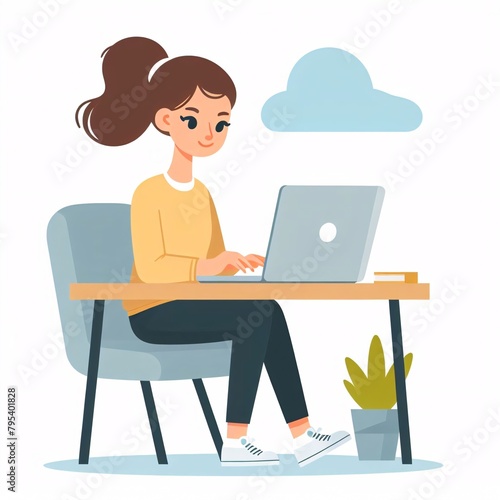 business, office, woman, computer, young, laptop, person, work, desk, female, cartoon, character, flat, online, job, sitting, home, cyberspace, workplace, modern, technology, communication, men at work, table, concept, web, freelance, professional, headset, occupation, support, design, lifestyle, manager, employee, desktop, chair, service, operator, student, call, client, relax, happy, adviser