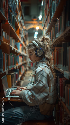 woman, young, library, bookshelf, book, laptop, working, studying, earphones, music, aisle, reading, learning, cognition, technology, education, concentration, sharpened, student, research, quiet, peaceful, warm, ambience, indoor, casual attire, comfortable, relaxed, sitting, typing, writing, digital, online, cyberspace, communication, female, girl, college, university