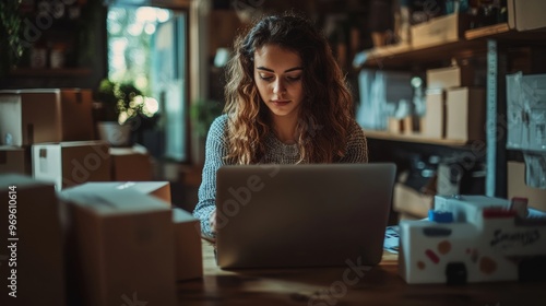 woman, female, young, adult, working, home office, entrepreneur, startup, laptop, computer, technology, cyberspace, online, e-business, shipping, cardboard box, box, cardboard, desk, table, wood, shelf, light, sharpened, serious, concentrated, business, small business