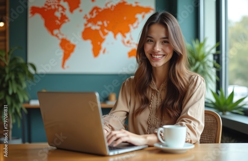 Young woman works on laptop in office space. Smiles at camera, looks happy, professional. World map on wall shows global travel destinations. Girl enjoys hot coffee, plans exciting new trips for