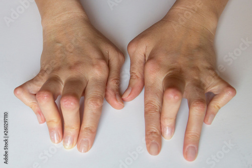 Young woman's hands deformed from Rheumatoid Arthritis.