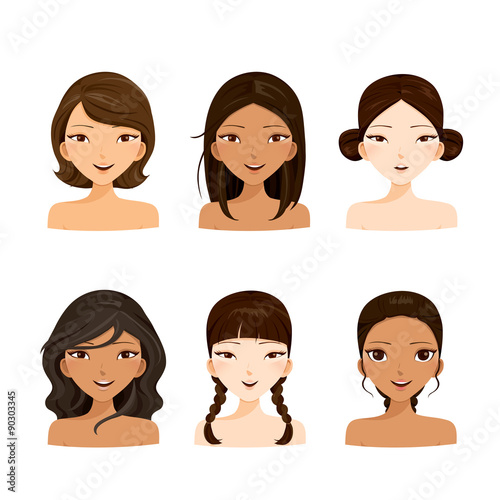 Young women faces with various hairstyles and skin, hair colors, ladies fashion, beauty