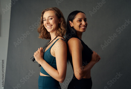 indoor, studio shot, grey background, female, woman, young adult, two people, exercise, fitness, physical exercise, work out, holding, jumprope, sports bra, leggings, activewear, active, physical, fit, athletic, strong, body, health, healthy, healthy lifestyle, lifestyle, wellness, training, brown hair, black hair, smiling, laughing, cheerful, happiness, friendship, back to back