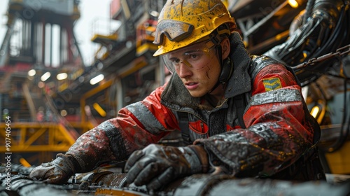 oil well, maintenance, men at work, rainy weather, machinery, industrial, safety-gear, hard hat, concentration, skill, equipment, oil industry, engineering, youth, labor, teamwork, tool, maritime, offshore, employment, perseverance, young adult, diligence, oil production, worksite, commitment, generative, ai