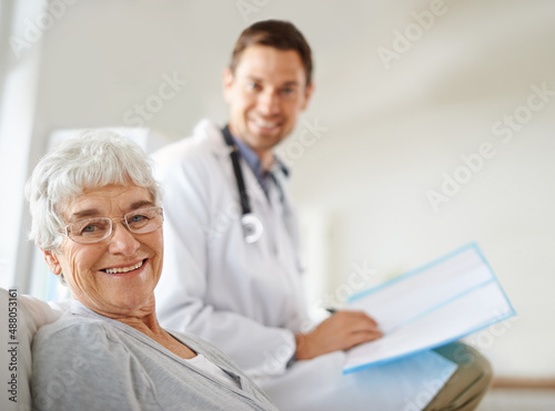 Youre in great hands. Shot of a handsome male doctor with a happy elderly patient.