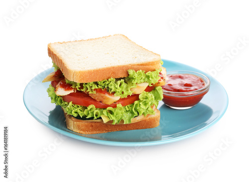 Yummy sandwich with ham, chicken meat, vegetables and sauce isolated on white