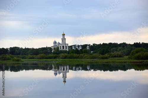 Yurievsky monastery with a beautiful reflection in the lake. Summer view with a cloudy sky.Lake Myachino Novgorod region