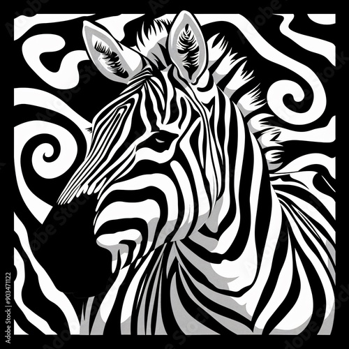 zebra, stripes, black, white, animal, portrait, swirling, pattern, background, wildlife, art, graphic, design, illustration, vector, abstract, nature, wild, head, face, eye, mane, ear, nose, mouth, hoof, tail, fur, hair, equine, mammal, africa, safari, savanna, monochrome, contrast, bold