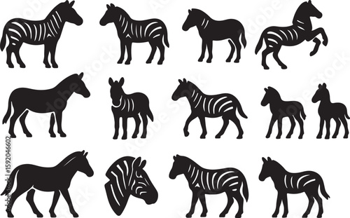 zebra, animal, silhouette, black, white, stripes, wild, nature, graphic, illustration, collection, set, mammal, equine, safari, savanna, africa, pattern, design, vector, simple, clean, isolated, art, drawing, creature, herd, group, fauna, wildlife