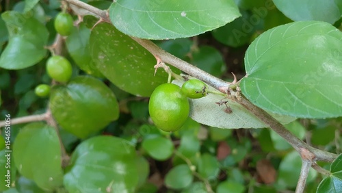 Ziziphus mauritiana or Bidara fruit on a plant in the garden. Also known as widara, Indian jujube, Indian plum, Chinese date, Chinese apple, ber and dunks.