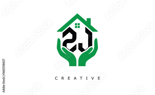 ZJ Home Care Logo - Green House and Hand Symbol for Real Estate, Eco Housing & Modern Branding