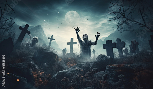 zombi saliendo de la tumba en cementerio entre tumbas durante la noche con cielo gris tormentoso y luna llena. concepto halloween