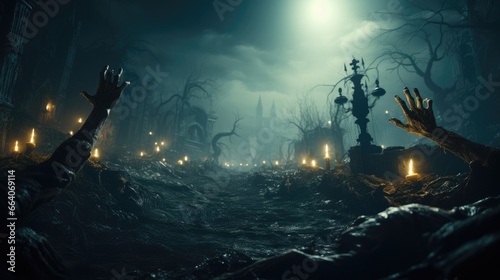 Zombie Hand Rising Out Of A Graveyard In Spooky Night.