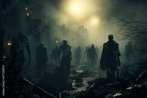 Zombies walking through a cemetery under the eerie moonlight, evoking a chilling atmosphere of the undead in the night. Ai generated