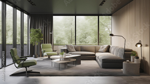 Zoom Background Modern Minimalist Office lounge with grey and green tones and seating