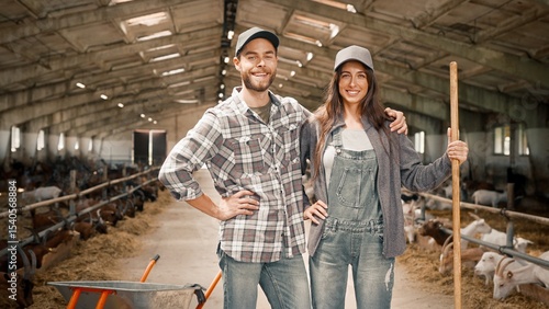 man, male, caucasian, woman, animal, female, couple, together, men at work, cleaner, farm, work, farmer, working, job, occupation, farming, industry, shed, barn, rural, village, domestic, stable, care, caring, herd, business, hard-working, stall, profession, tied-up, happy, smile, smiling, standing, looking, emotion, joy, joyful, hugging, teamwork, partner, goat, lamb, sheep, wheelbarrow, indoor, attractive