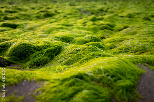 Zostera is a small genus of widely distributed seagrasses or marine eelgrass). Wet bright green plants on the beach of Sylt island at low tide in world heritage National Park “Wattenmeer“ Germany