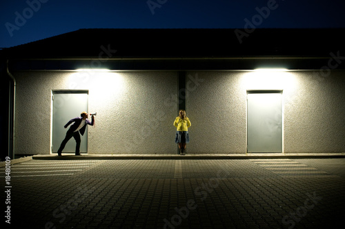 couple, 2, man, woman, girl, boy, standing, scream, communication, fashion, blond, style, modern, cool, light, door, parking, house, building, architecture, aesthetic, unique, dark, dark, elegant, trendy, individual, together, common, love, equilibrium, balance, spotlight, lamp